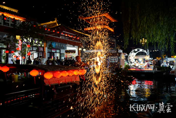 白天,游客可体验投壶、射箭等传统民俗项目;晚上,各类演艺活动更添魅力。在丝路友谊园,呐喊声与荧光棒交织成一片欢腾的“热浪”,首次举办的电音嘉年华吸引观众1.2万余人次;在众春园,国潮飞天秀、非遗火壶、敦煌情景剧轮番上演,单日最高接待游客突破4万人次。古韵与新潮巧妙融合,城市新地标正悄然见证千年古城的焕新之路。