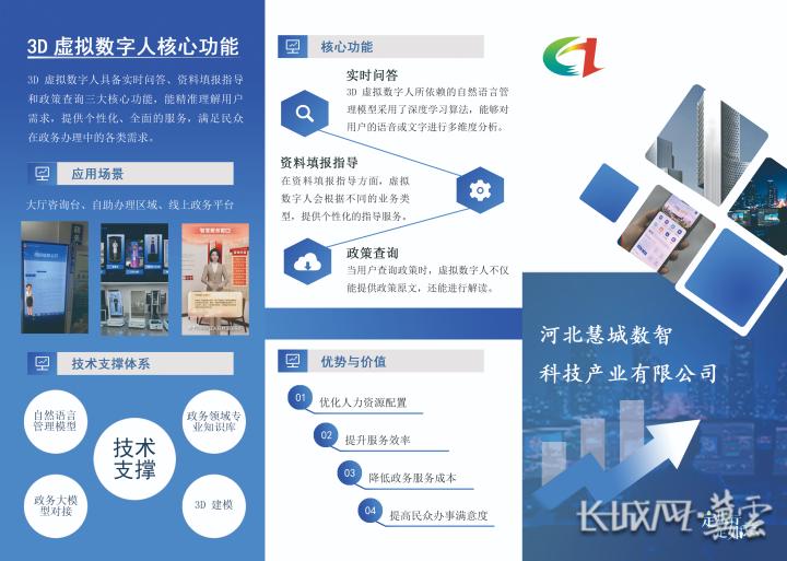 作为政府主导的数字经济“国家队”,河北慧城数智科技产业有限公司自主研发的3D虚拟数字人,集成自然语言处理、高精度建模等前沿技术,可提供24小时不间断的实时问答、政策解读与资料填报指导服务。该数字人能适配政务大厅、线上政务平台等多场景,有效打破传统政务服务的时空限制,显著提升服务效率与群众体验。