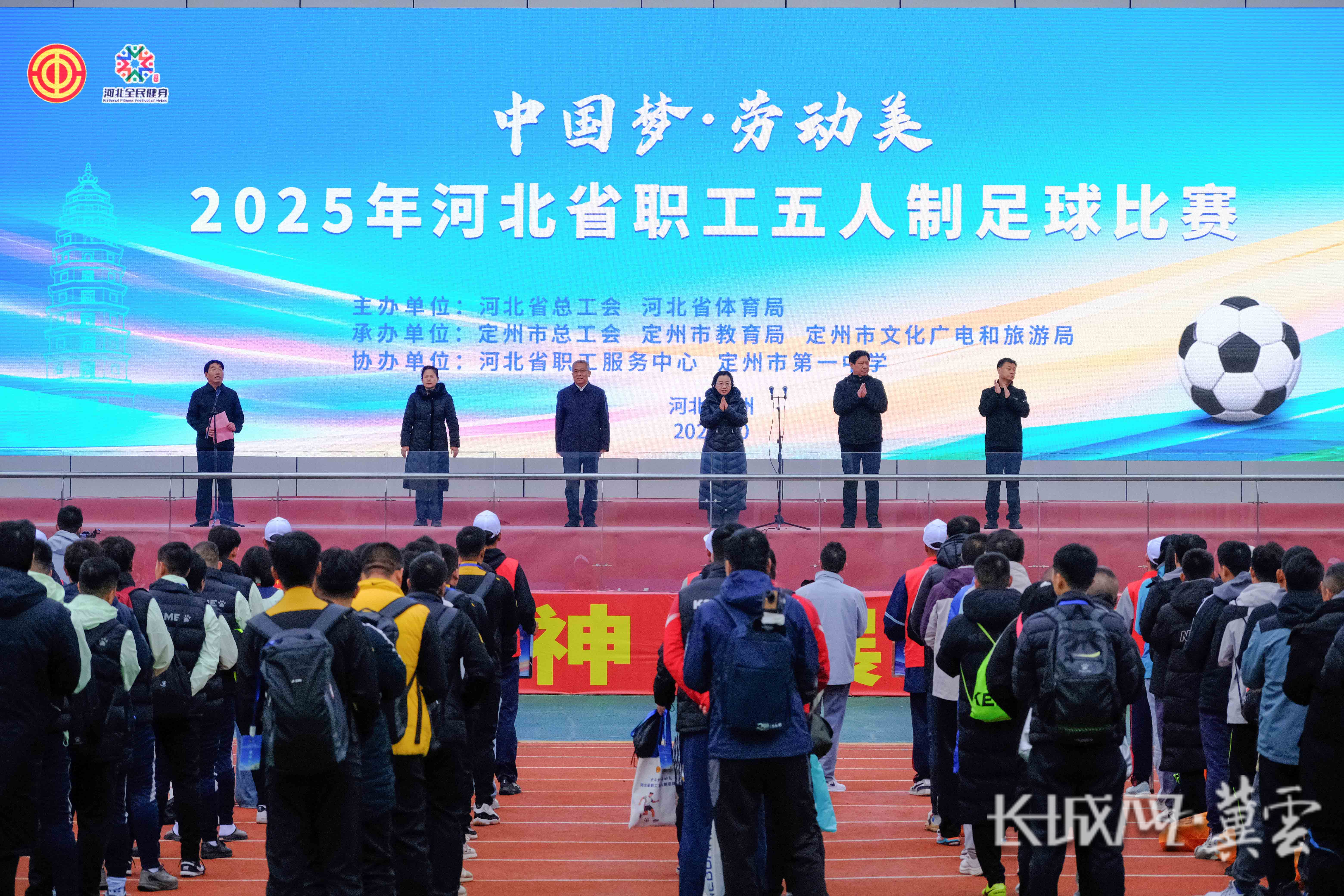长城网·冀云客户端10月22日讯(李征航)为丰富职工文化生活,营造全民健身浓厚氛围,10月22日,“中国梦·劳动美”2025年河北省职工五人制足球比赛在定州市第一中学体育场正式开赛。来自全省各地16支代表队的近200名职工球员将在为期三天的比赛中,为到场观众上演一场场精彩的足球大战,充分展现新时代劳动者昂扬向上的精神风貌。