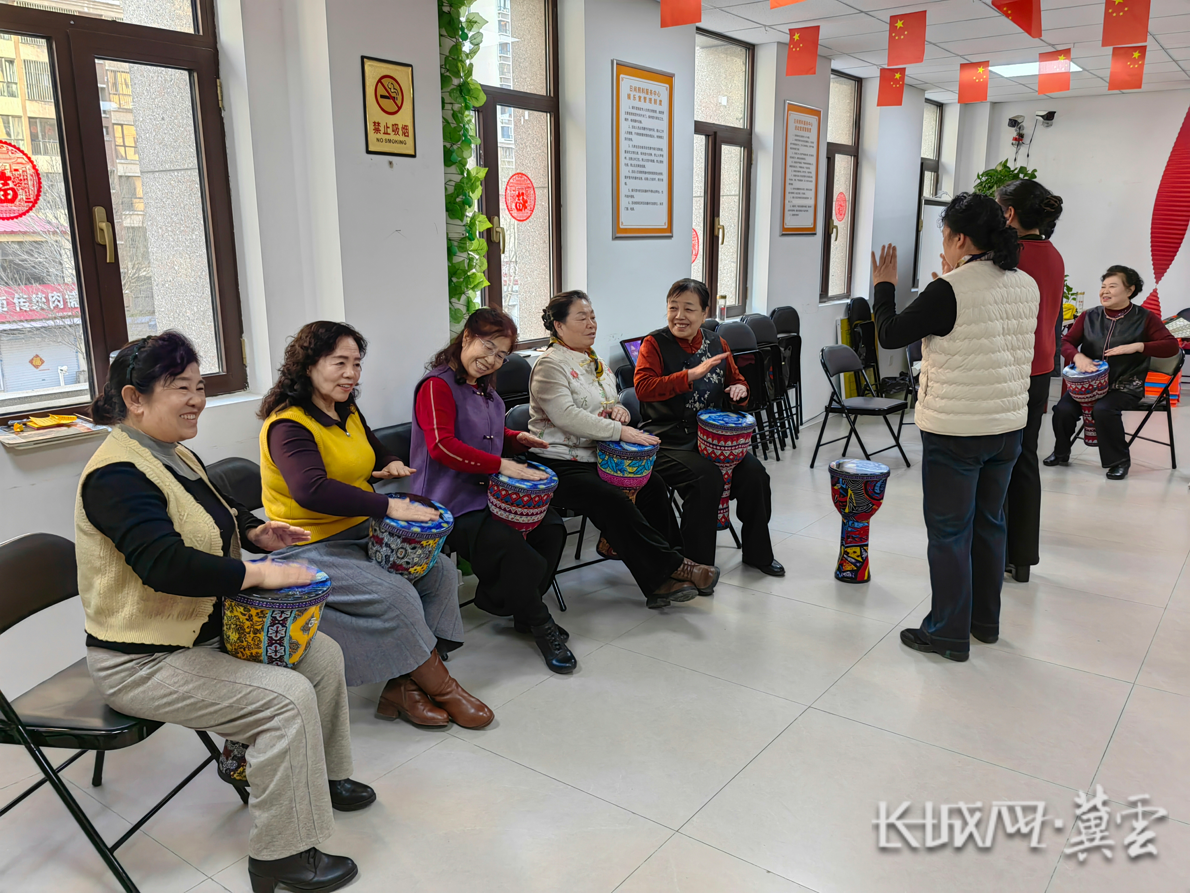 老人在缔景城社区日间照料服务中心学习手鼓。长城网·冀云客户端记者 赵绅光 摄
