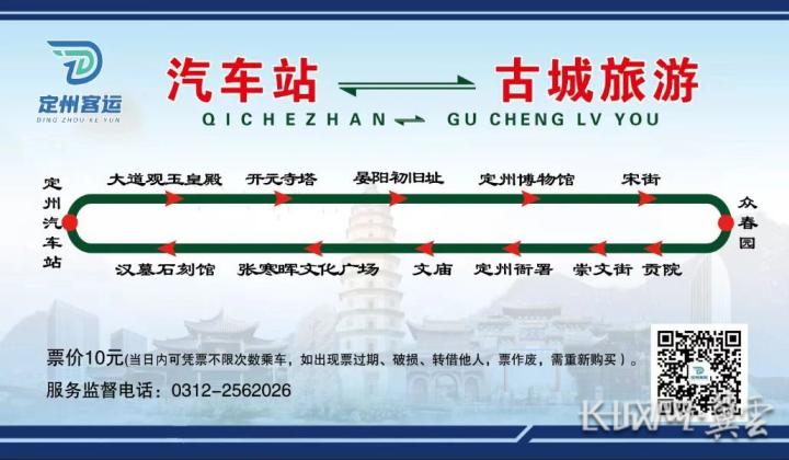 定州汽车站—大道观玉皇殿—开元寺塔—晏阳初旧址—定州博物馆—宋街—众春园—贡院—崇文街—定州衙署—文庙—张寒晖文化广场—汉墓石刻馆