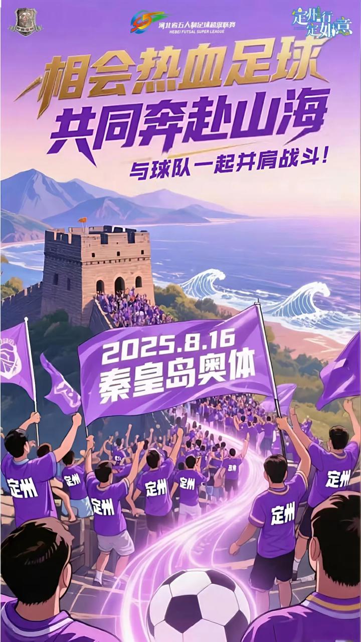 长城网·冀云客户端讯(记者 李沛涵 通讯员 安文硕)8月10日,2025年河北省五人制足球超级联赛在石家庄中山体育馆开赛。定州队首战将于8月16日19:00打响,客场出征秦皇岛市奥体中心体育馆,与秦皇岛队一较高下。对此,定州发布“球迷远征召集令”,征集球迷赴现场为球队加油助威。