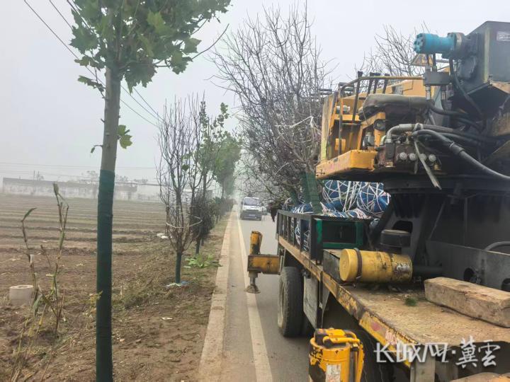 市交通运输局坚持分区实施、同步推进,重点聚焦清留路沿线和东亭至李村店西段两个路段,前期组织专班全面摸排,精准掌握缺株、枯死情况,严格落实“缺株补株、适地适树”原则,优选法桐、海棠、油松、白蜡等优质树种,注重与原有绿化格局协调统一。施工中,严格执行标准化流程,精细完成挖坑、培土、支撑、浇水等环节,同步清理杂物、修剪老树,做到“补一处、活一片、成一景”。