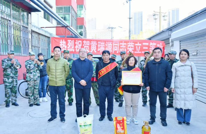 在明月店镇赵家洼社区,伴着喜庆的锣鼓声,送喜报队伍来到赵川家中。工作人员为赵川家属披上绶带,现场宣读颁发了立功喜报,并送上慰问品,感谢他们对赵川投身军队、一心报国的支持,为国家、为军队培养了优秀的人才。