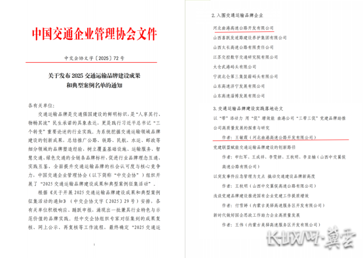 长城网·冀云客户端讯(通讯员 于怡凡 刘伟)近日,在中国交通企业管理协会发布的2025交通运输品牌建设成果与典型案例名单中,曲港公司斩获两项重要荣誉。其中,公司入围“交通运输品牌企业”,论文《以“带”添动力 用“促”增效能 曲港公司“三带三促”党建品牌助推公司高质量发展的探索与研究》则获评“交通运输品牌建设实践落地论文”。