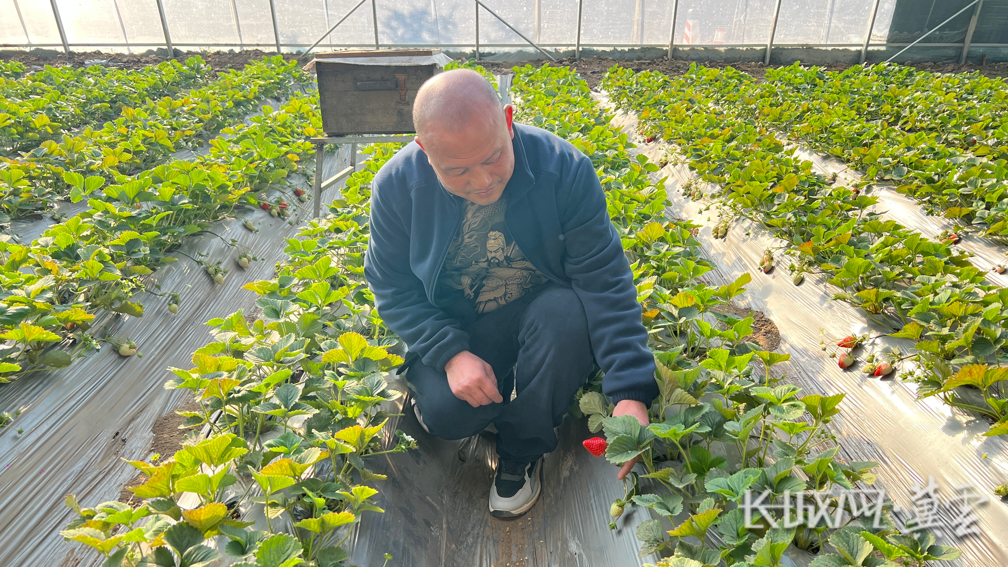 运营负责人高二伟查看草莓长势。长城网·冀云客户端 李征航 摄