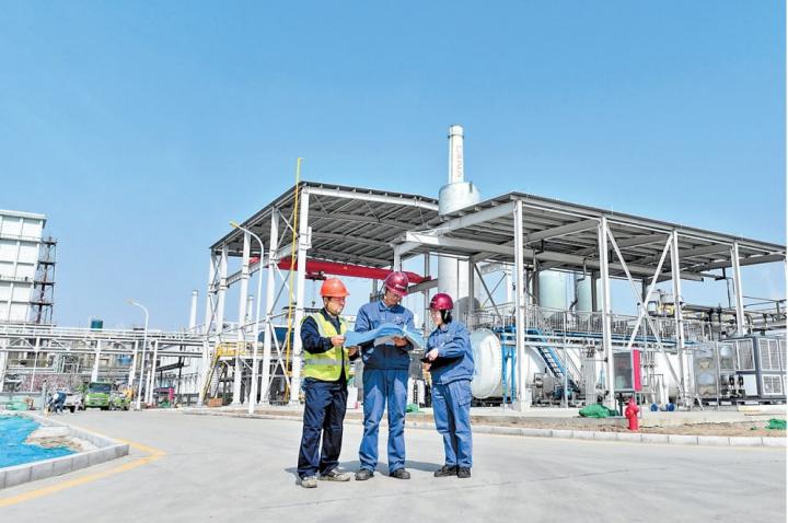 4月2日,在定州旭阳氢能有限公司日产5吨液氢示范项目建设现场,工作人员正在进行施工工艺检查。河北日报记者 徐华 摄