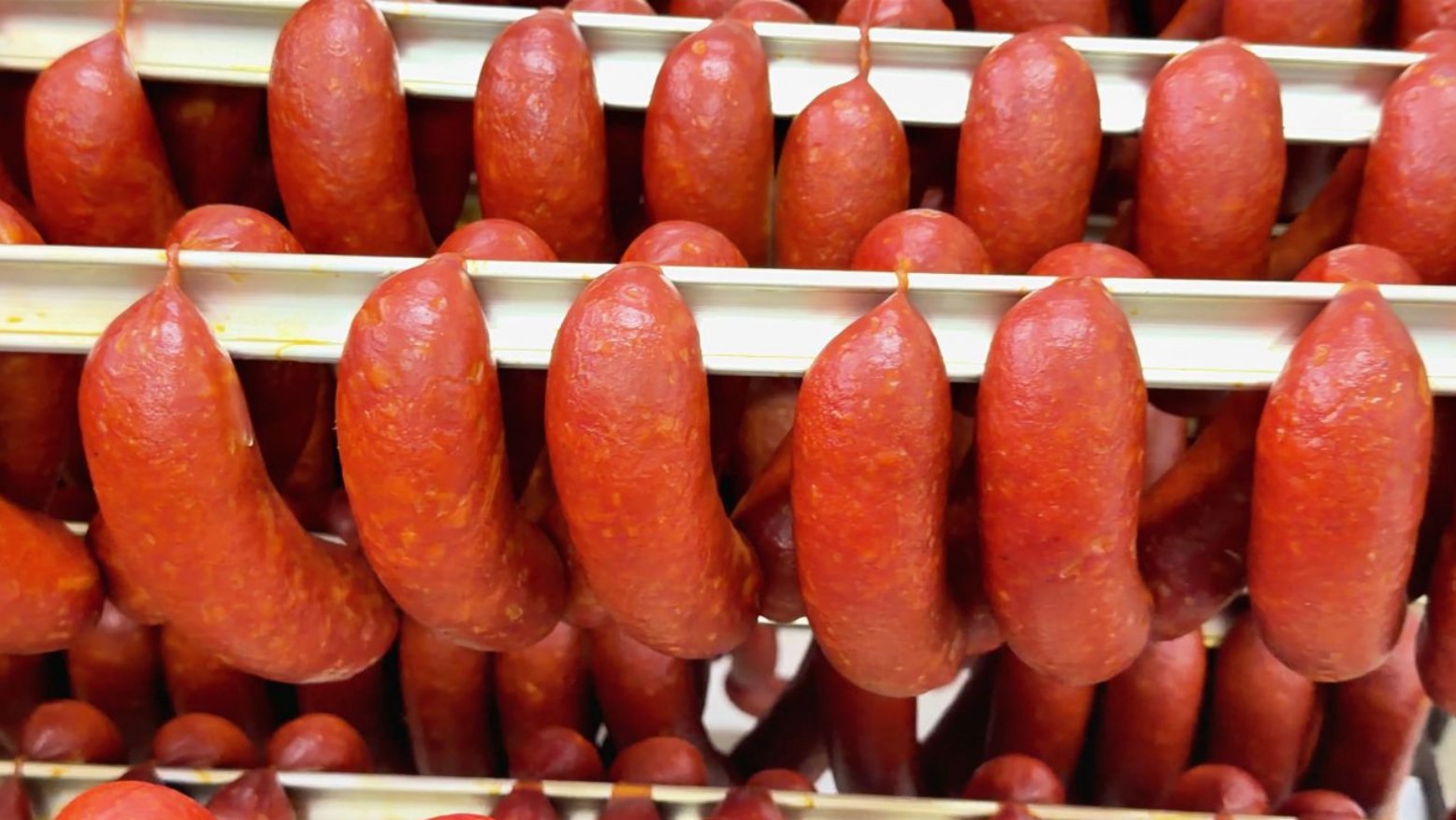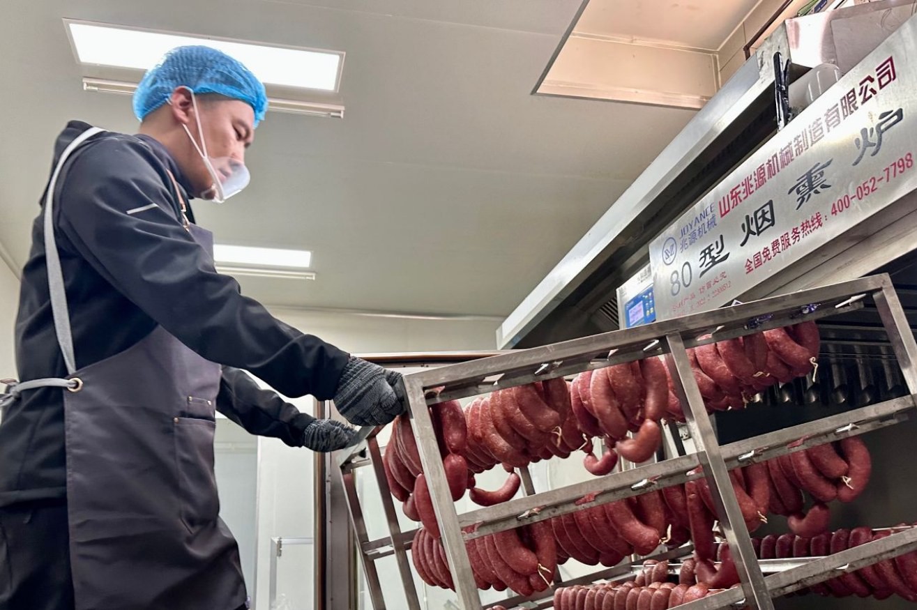 “咱这牛肉肠选用的都是脱酸冷鲜肉,搭配天然香辛料,经过腌制、灌装、熏制等十几道独特工序,口感醇香回甘、满口生香,老人孩子都爱吃。”白瑞一边查看生产进度,一边向记者介绍。