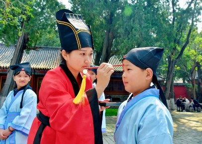 在浓厚的文化氛围熏陶下,一场庄重而温馨的汉服尊师礼在文庙内举行,学生们整理衣冠、恭敬行礼,以传统礼仪致敬先贤,真切感受尊师重道、崇礼尚学的文化内涵。依次进行的朱砂启智仪式上,老师为每名学子轻点朱砂痣,寓意开启智慧、目明心亮,勉励大家勤学善思、立志成才。随后,学生们依次击鼓三声明志向,以庄重的仪式感,践行研学初心,传承优秀传统文化。